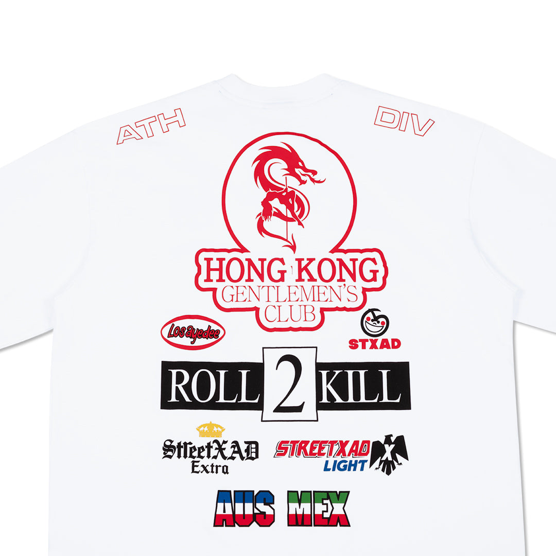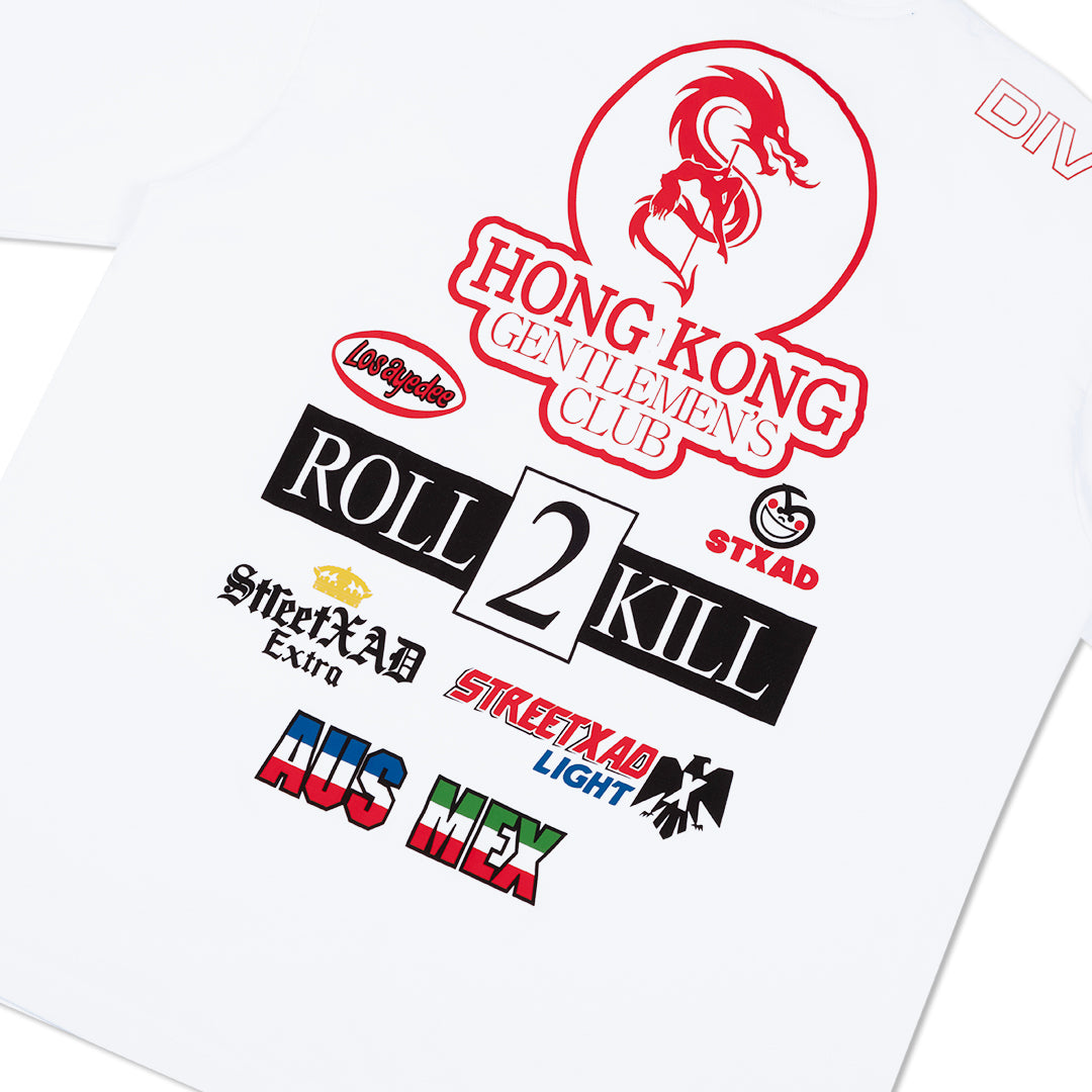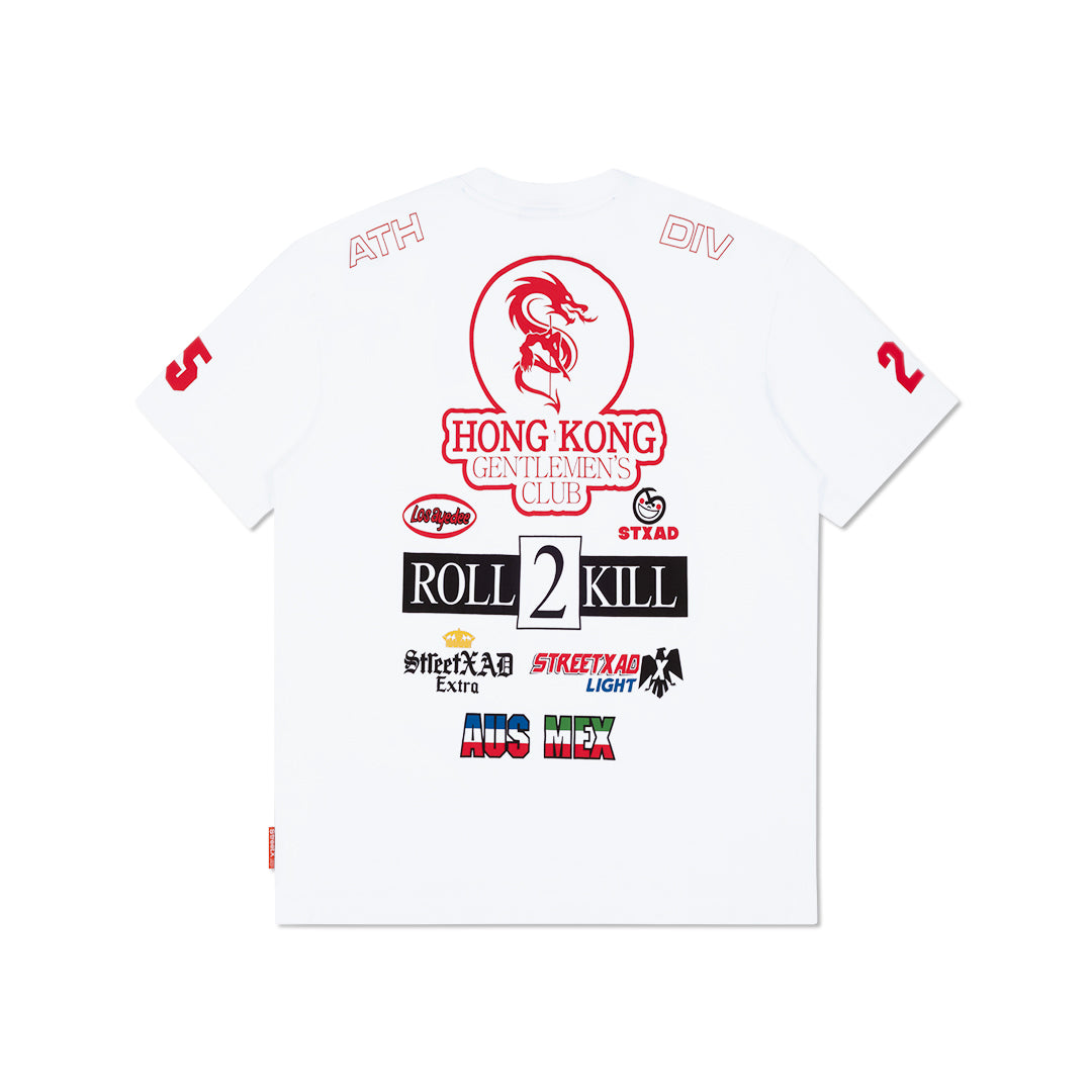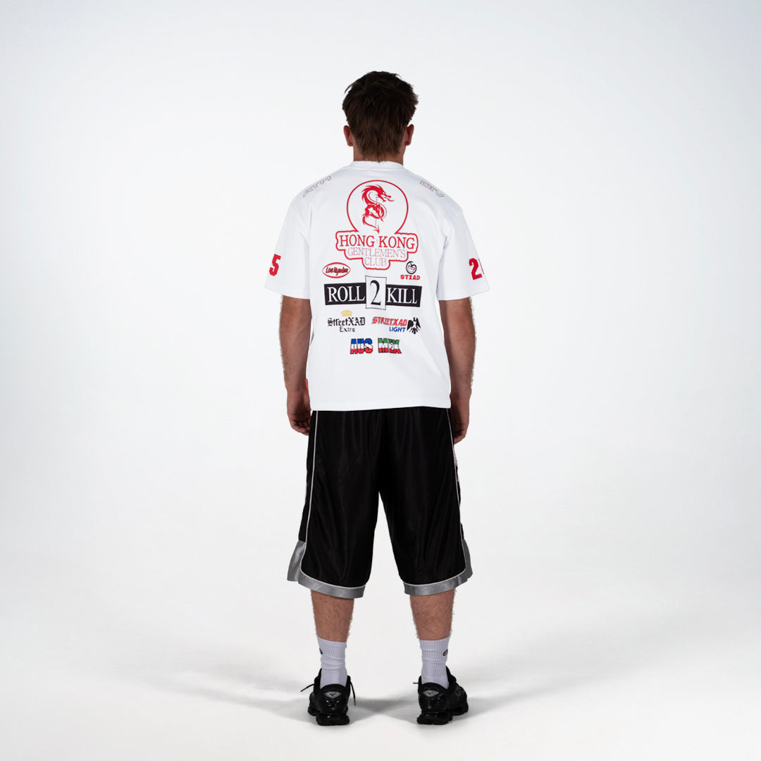 Sleeve prints and upper-shoulder placements add to the stacked, high-energy composition